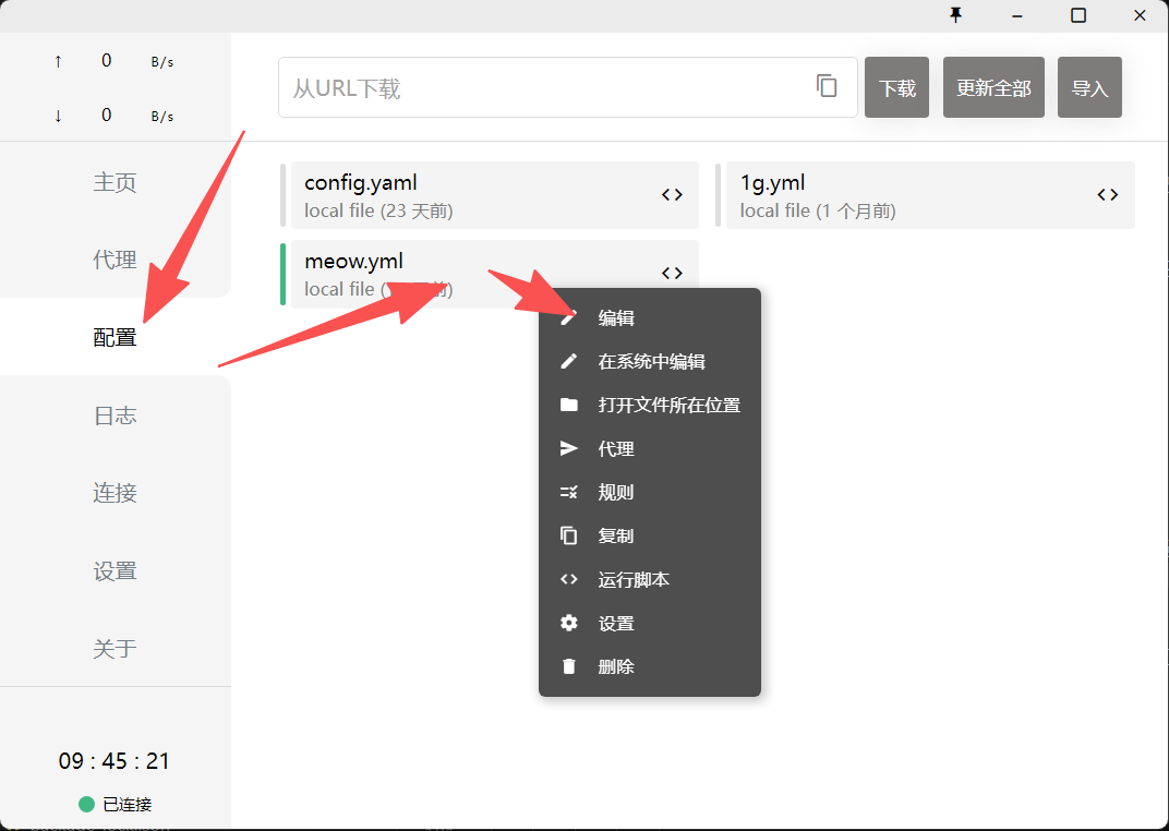 打开小猫咪点击配置,右键正在使用的代理,选择编辑