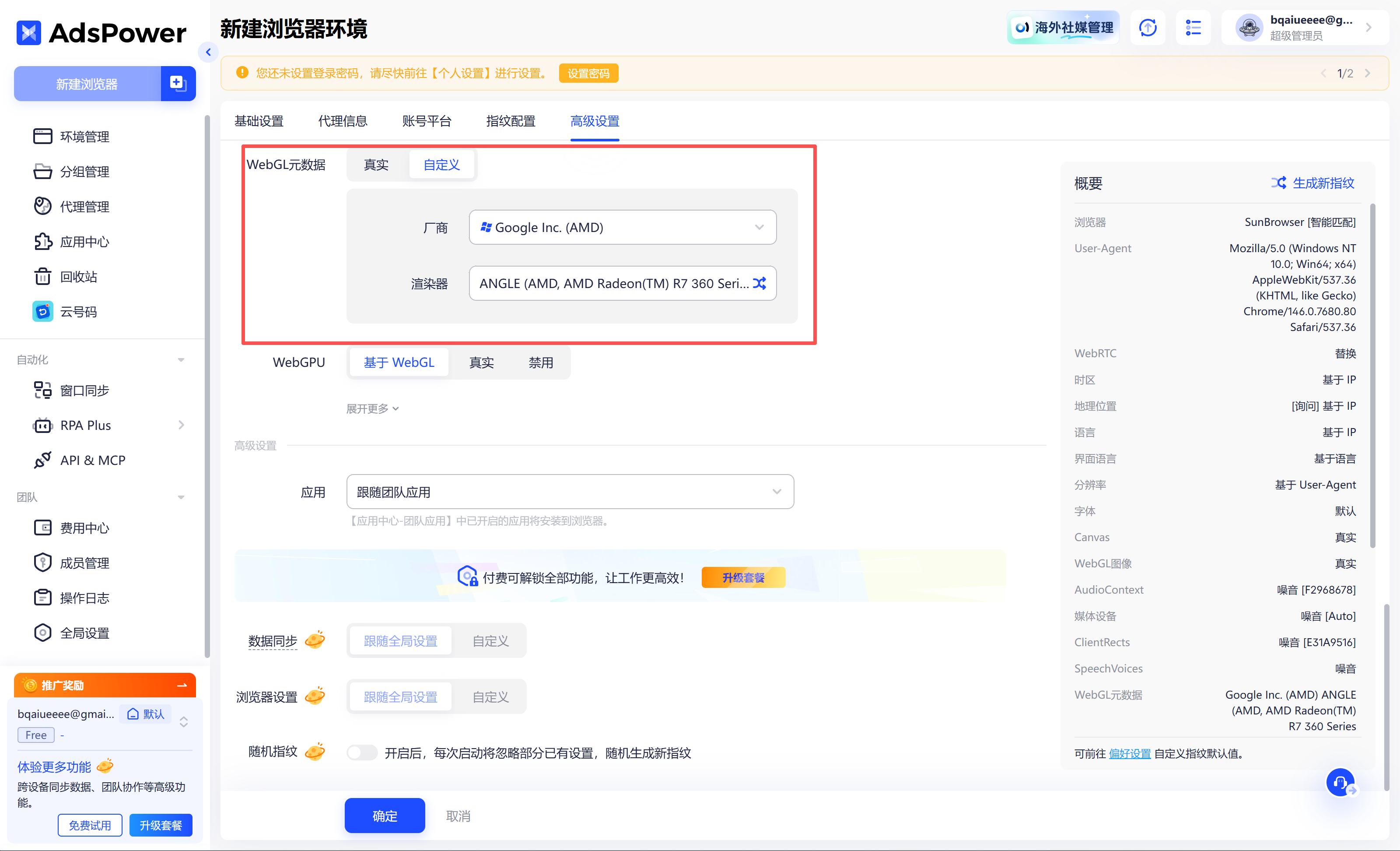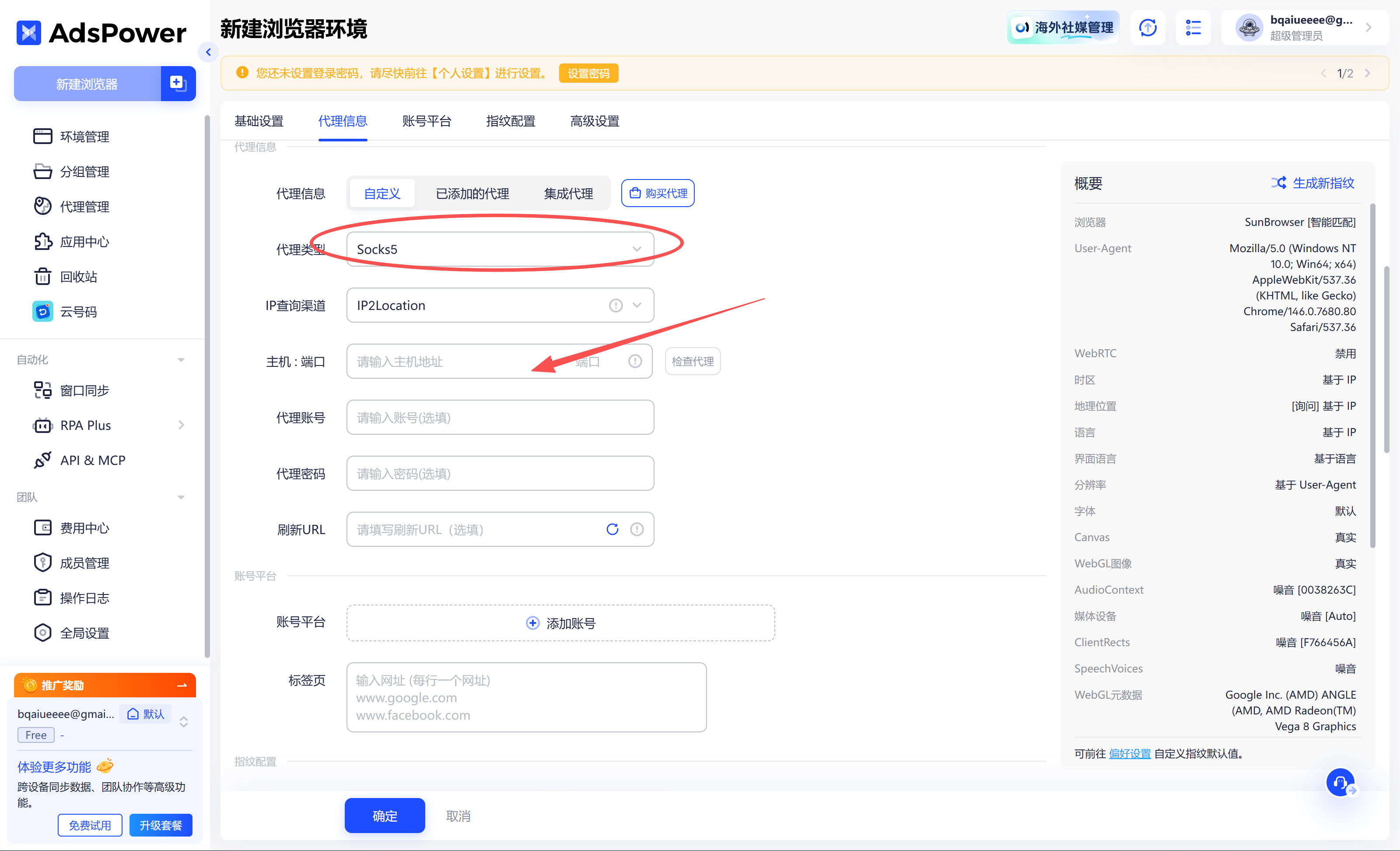我使用的是adspower浏览器创建环境,下载下来使用的,自行注册登录后