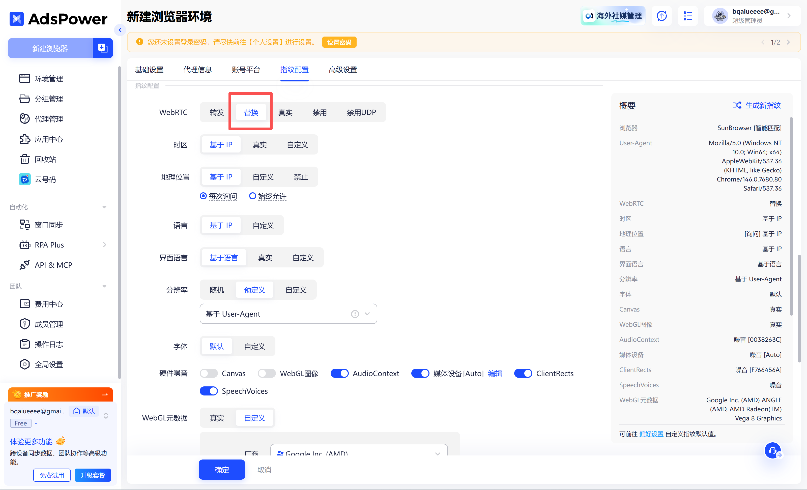 WebRTC改为 替换 ,地理位置设置为“基于 IP 自动匹配”,并开启允许询问