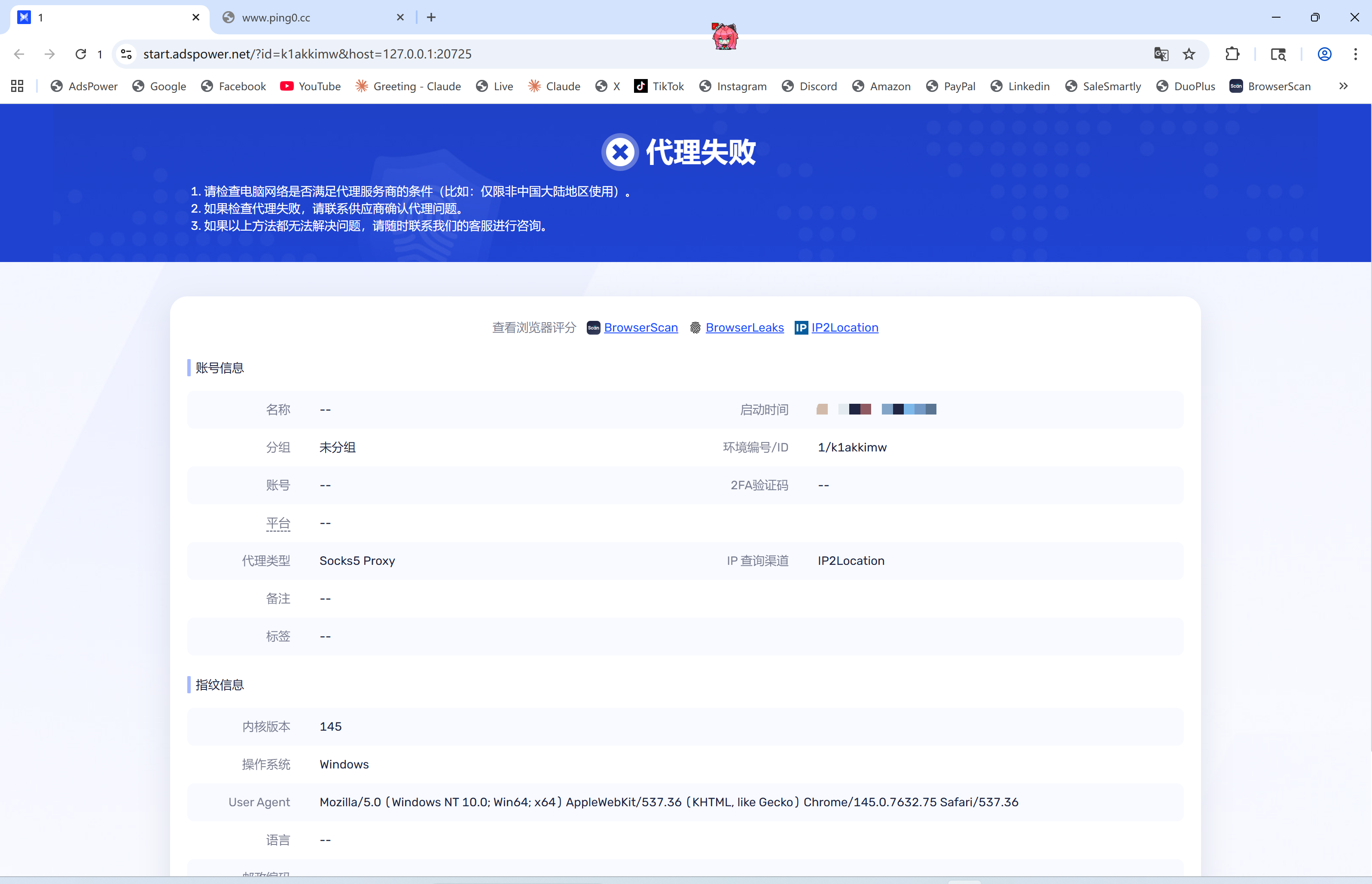 确保选择的代理类型为 Socks5,把静态住宅IP相关内容直接复制在这里粘贴,点检查代理是否ping成功
