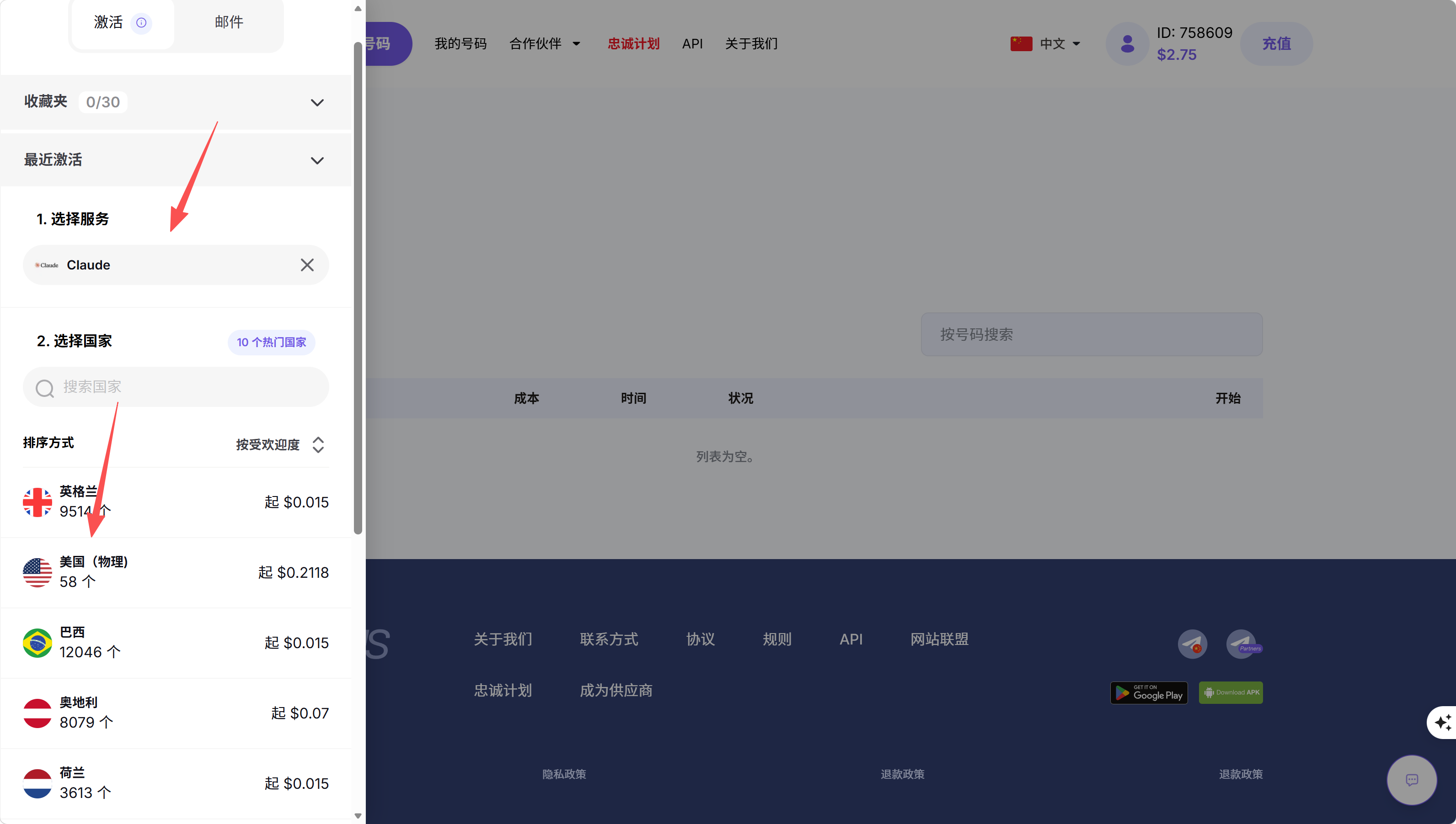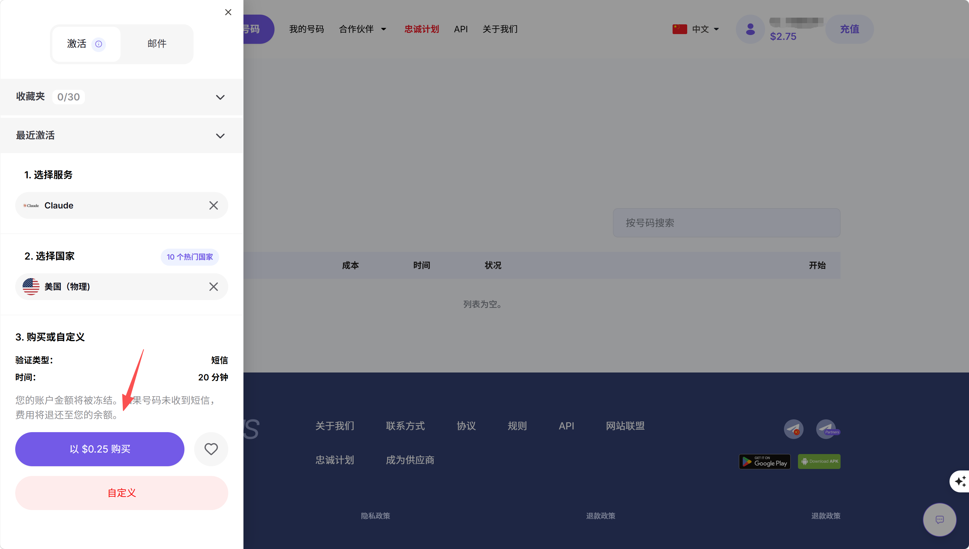 选择服务 claude 选择国家 美国 以$0.25购买,会给你一个号码,复制粘贴到Claude注册吧,到时候有验证码接码平台会转发给你,后面正常注册就可以啦